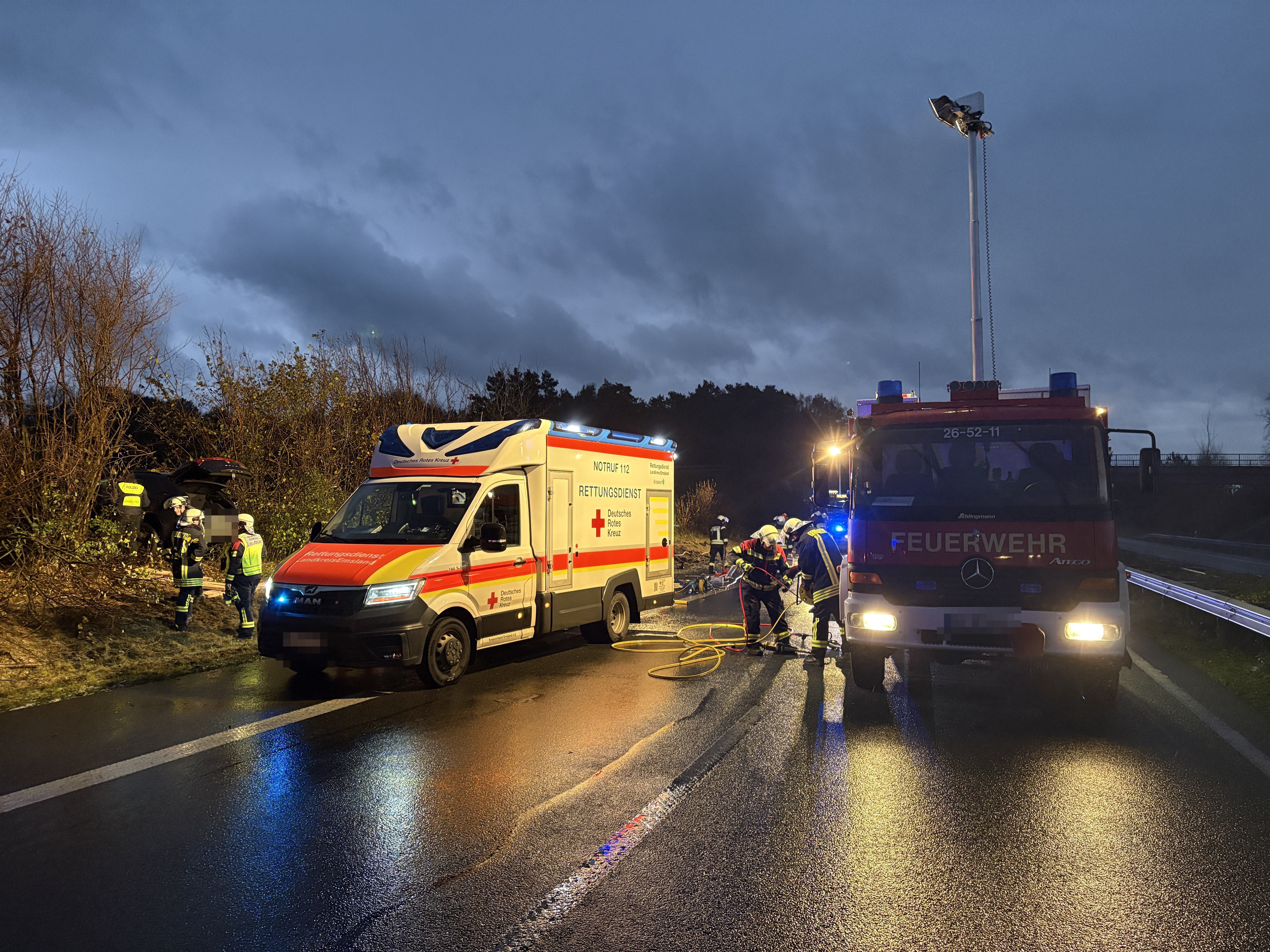 Neben der Feuerwehr waren der Rettungswagen des DRK Emsland aus Salzbergen, der Notarzt des Christoph Europa II aus Rheine sowie zwei Streifenwagen der Autobahnpolizei Lingen vor Ort.