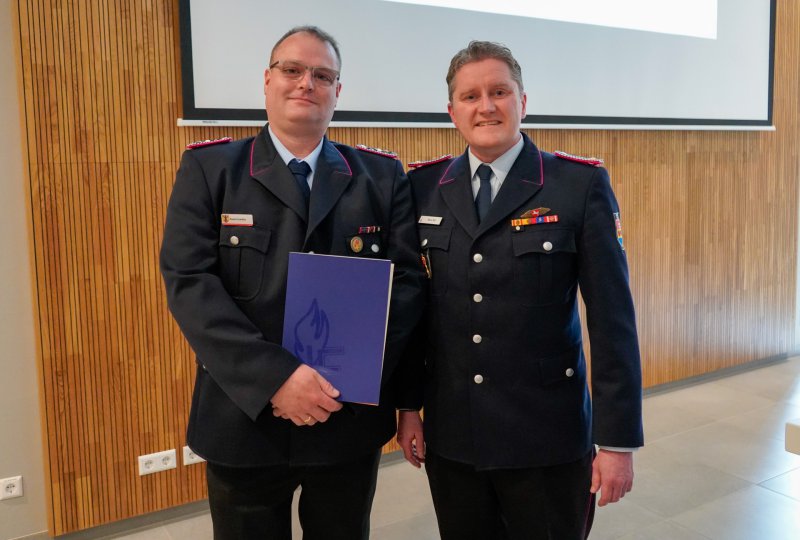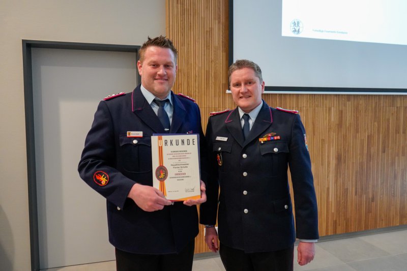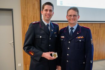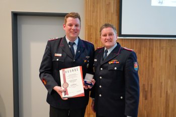 Weiterhin wurden auch Florian Schulte und Daniel Scheffer mit dem Ehrenzeichen der Niedersächsischen Jugendfeuerwehr vom Kreisjugendfeuerwehrwart Klaus Smit für ihre langjährige Arbeit in der JF ausgezeichnet.