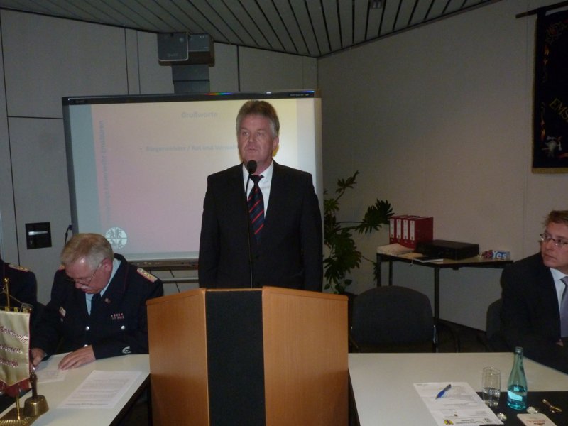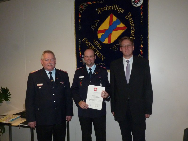 In den anschließenden Grußworten hob Bürgermeister Bernhard Overberg das Engagement der Feuerwehrleute hervor und dankte ihnen ausdrücklich für das Geleistete. Er berichtete kurz über die aktuellen Sachstände bezüglich der Neuanschaffung eines Einsatzleitwagens und dem Neubau eines Feuerwehrgerätehauses. Dezernent Marc-Andre Burgdorf vom Landkreis Emsland schloss sich den Worten des Bürgermeisters an und unterstrich die Schlagfertigkeit der emsländischen Feuerwehren. Er verdeutlichte, dass die Politik im Emsland voll hinter den Feuerwehren stehe und für deren Belange immer ein offenes Ohr habe. Abschließend berichtete er kurz über den aktuellen Sachstand bezüglich der Einführung des Digitalfunks im Landkreis. Bezirksabschnittsleiter Emsland-Süd Alfons Acker verkündete, das letzte Mal in dieser Funktion an der Jahresdienstversammlung teilzunehmen. Altersbedingt wird er das Amt im Sommer dieses Jahres abgeben. Pastor Stephan Schweegmann von der kath. Kirchengemeinde Emsbüren stellte sich als neuer Pastor vor. Ralf Rickling, Leiter der DLRG Ortsgruppe Emsbüren, blickte auf die gute Zusammenarbeit im vergangenen Jahr zurück. Bei vier gemeinsamen Einsätzen habe die Zusammenarbeit reibungslos funktioniert.