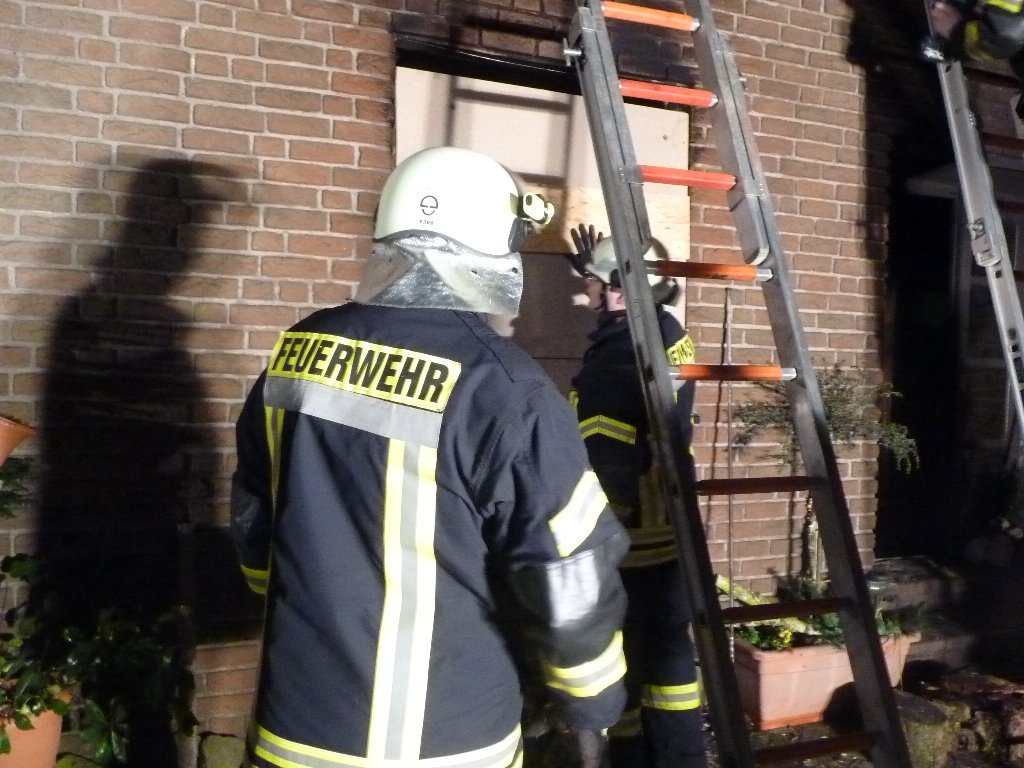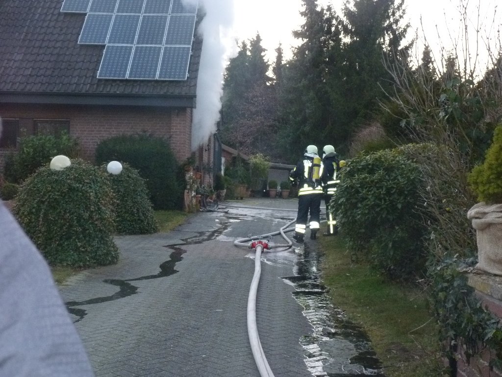 Als die ersten Einsatzkräfte am Einsatzort eintrafen, schlugen bereits Flammen aus dem Küchenfenster und aus der direkt daneben liegenden Haustür. Die Flammen schlugen bis unter das Dach. Der Einsatzleiter entschied sich daraufhin umgehend das Alarmstichwort von "Küchenbrand" auf "Gebäudebrand" zu erhöhen, sodass Vollalarm für die Feuerwehr Emsbüren ausgelöst wurde.