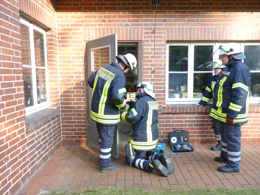 Die zuerst eintreffende Polizei konnte über einem Fenster Kontakt zum Bewohner aufnehmen. Dieser lag im Bett, war jedoch außerstande dies zu verlassen. Kurz darauf traf die Feuerwehr Emsbüren ein. Mit einem sogenannten Zieh-Fix konnten wir die Hintertür öffnen und schnell zum Patienten gelangen.