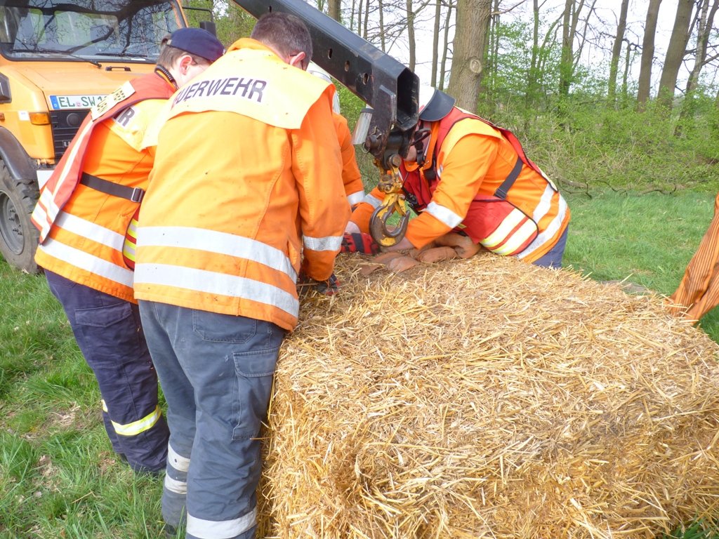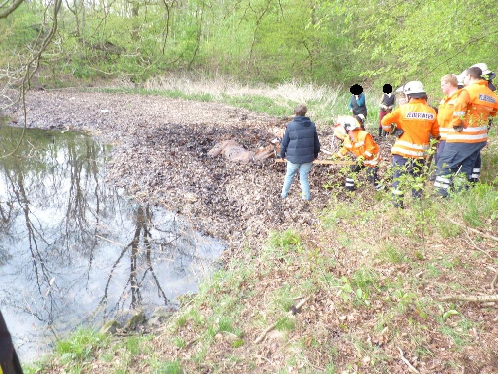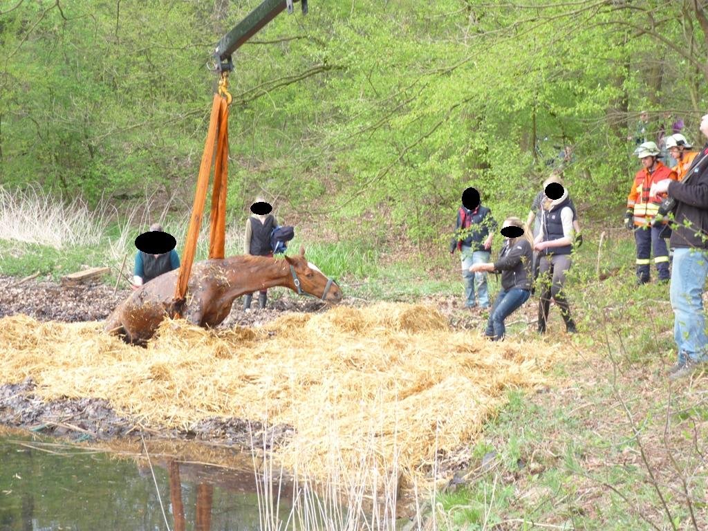 Viele freiwillige Helfer eilten sofort zur Unglücksstelle. Trotz großen Aufwands gelang es ihnen jedoch nicht, das Tier aus seiner misslichen Lage zu befreien. Schließlich riefen sie die Freiwillige Feuerwehr Emsbüren zur Hilfe, die mit 22 Einsatzkräften und 5 Fahrzeugen ausrückte