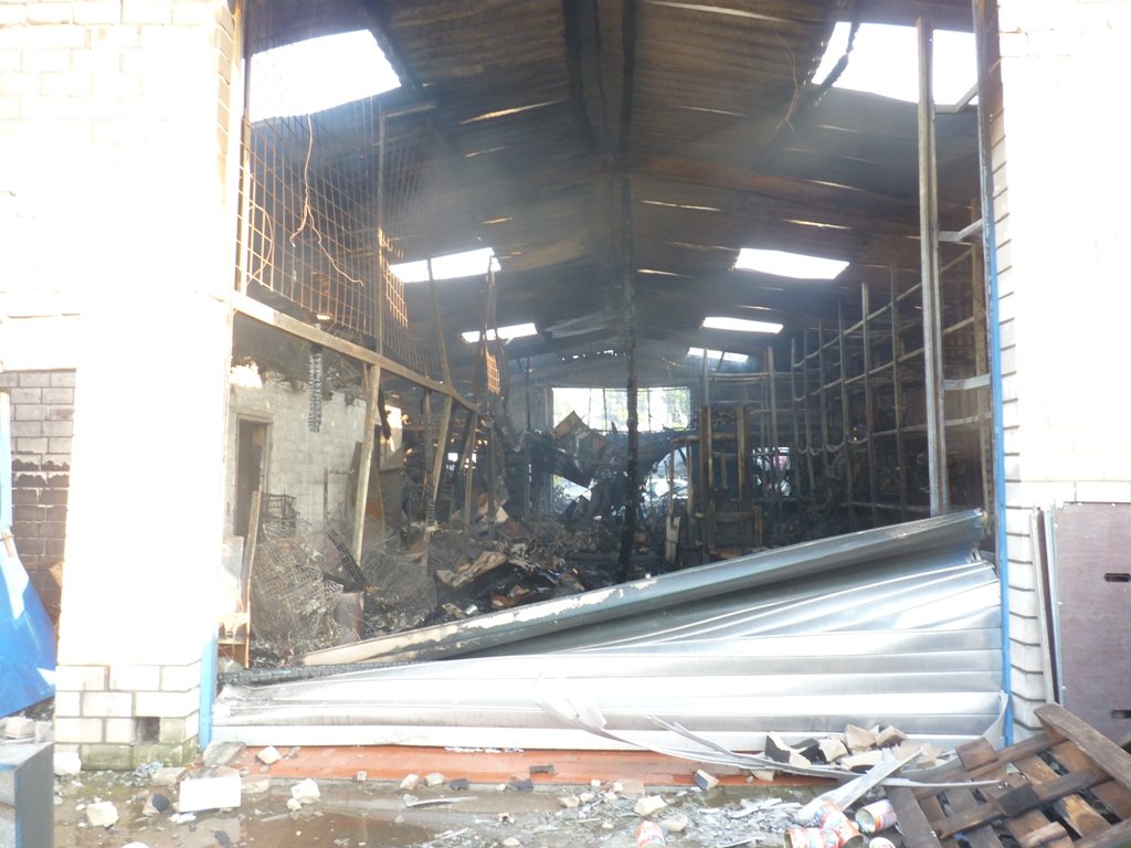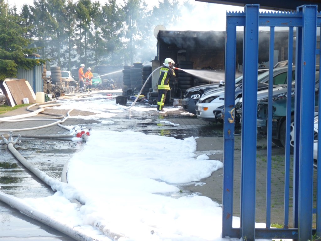 Bei Eintreffen der ersten Kräfte stand eine Werkstatthalle eines Autohändlers in Vollbrand und das Feuer drohte auf eine direkt angrenzende Fahrzeuglackiererei überzugreifen. Letzteres konnte durch eine Riegelstellung verhindert werden. Aufgrund der enormen Brandausbreitung und der hohen Einsturzgefahr des Gebäudes mussten sich die Feuerwehrleute auf die Brandbekämpfung von außen beschränken. Dies war jedoch nur unter schwerem Atemschutz möglich. Um schnellst möglich sämtliche Wasserreserven zur Verfügung zu haben und den Pool an Atemschutzgeräteträgern zu erweitern, wurden die Feuerwehren aus Salzbergen und Bramsche zur nachbarschaftlichen Löschhilfe hinzugezogen. Allein die Feuerwehr Emsbüren setzte 24 Atemschutzgeräteträger ein. Auch der ABC-Zug des DRK Bawinkel kam zum Einsatz. Er nahm in einem großen Umkreis Messungen der Umluft vor. Die Messungen ergaben einen erhöhten Chlorgehalt in der Luft. Aus Gründen der Sicherheit durften die Anwohner zweier Häuser ihre Wohnungen nicht mehr betreten. Eine direkt angrenzende Autolackiererei musste evakuiert werden. Kräfte mehrerer DRK SEG-Einheiten aus dem Emsland versorgten die rund 130 Einsatzkräfte der Feuerwehren Emsbüren, Salzbergen und Bramsche mit Getränken und Essen.