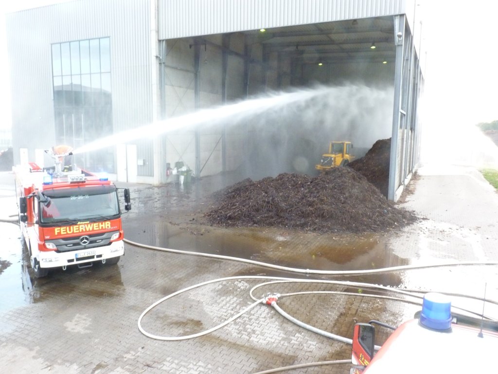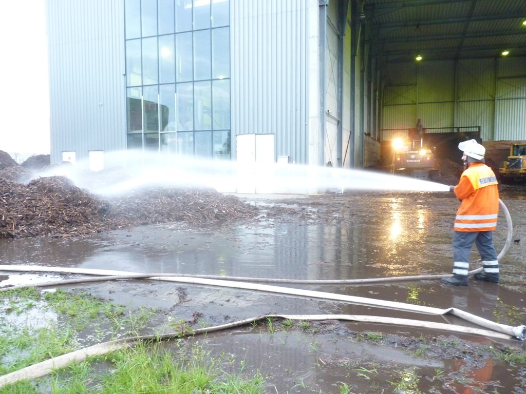 Vor Ort brannte in einer ca. 40x20m großen Lagerhalle ein großer Holzschnitzelvorrat, der für die Verbrennung im firmeneigenen Holzkraftwerk verwendet wird. Durch das Feuer entstand eine massive Rauchentwicklung. Umgehend drangen mehrere Trupps unter schwerem Atemschutz in die Halle vor und nahmen die Brandbekämpfung auf. Zusätzlich wurden zwei Wasserwerfer zum Einsatz gebracht. Die Wasserversorgung wurde über verschiedene Wasserentnahmestellen sichergestellt. Neben direkt in der Nähe gelegenen Teichen wurden auch Hydranten und Saugbrunnen zur Wasserentnahme verwendet.