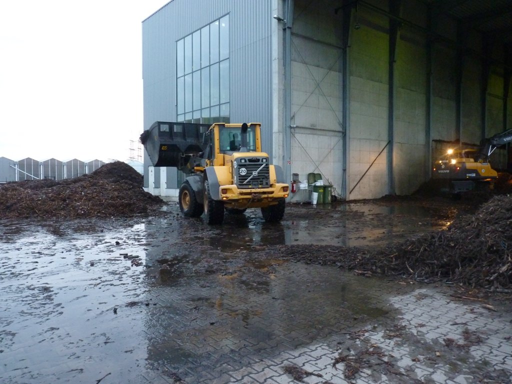 Um den Brand endgültig zum Erlöschen zu bringen, musste das Brandgut aufwendig mit einem Radlader aus der Halle gefahren und im Freien abgelöscht werden.