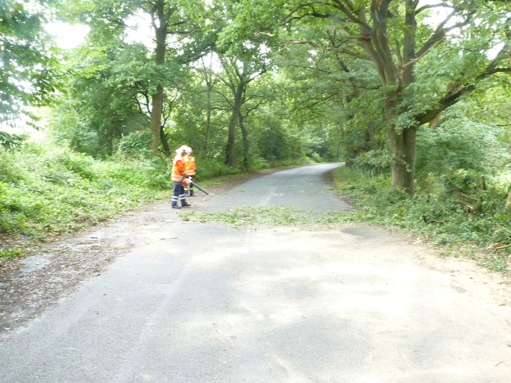 Mit einem Zugseil und einer Motorsäge entfernten die Einsatzkräfte kontrolliert den Ast und machten somit die Straße wieder für den Verkehr passierbar.