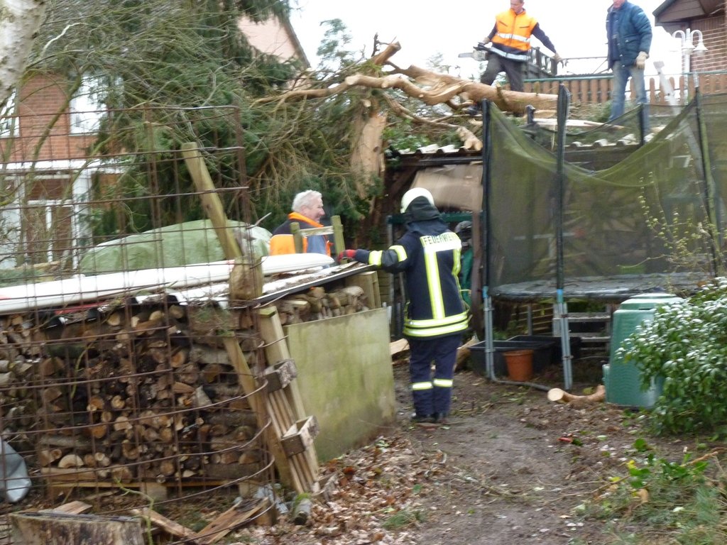 Nachdem der Einsatz "Baum auf Garage" beendet war, erreichte uns das nächste Hilfeersuchen. Im Ortsteil Mehringen waren im Waldstück zwischen der Mühlenstraße und der Karolinenstraße mehrere Bäume derart beschädigt, dass sie auf Grundstücke zu fallen drohten. Zwei Bäume hatten den Sturm bereits nicht mehr Stand halten können und waren auf einen Geräteschuppen im Garten eines Mehrfamilienhauses gestürzt.