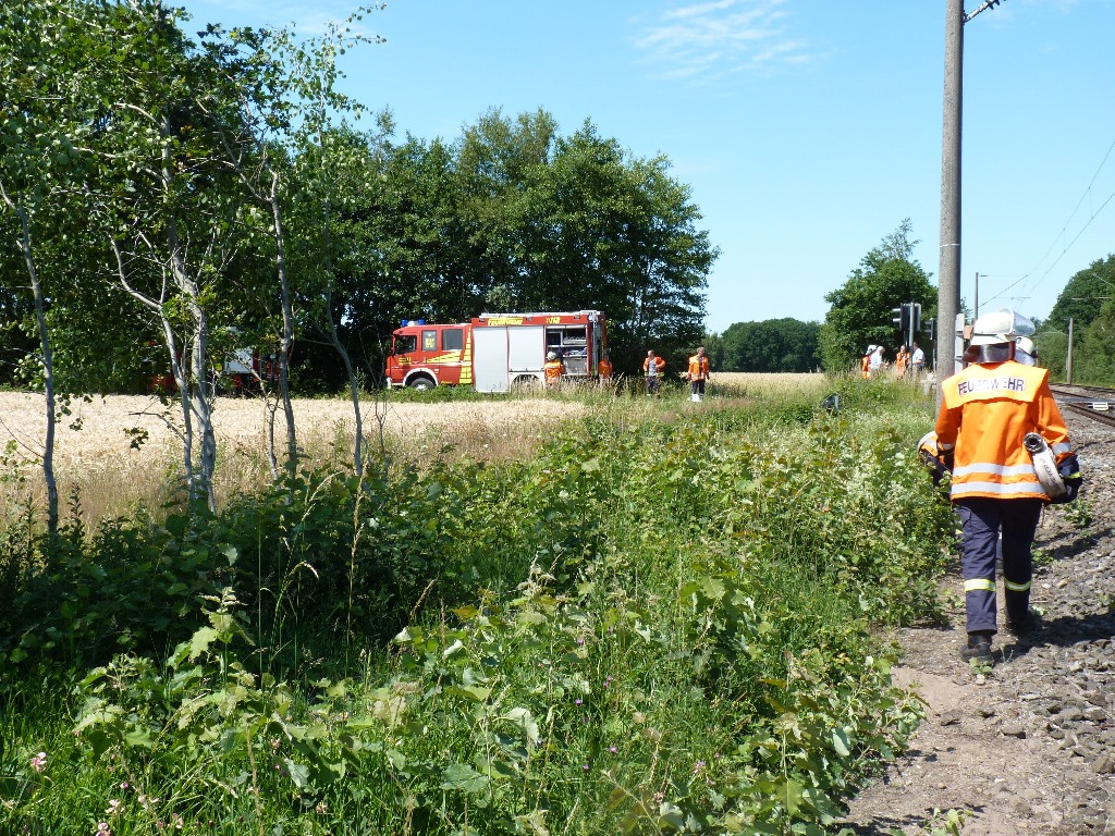 Während sich die Mitglieder der Höhenrettungsgruppe in Salzbergen im Einsatz befanden, wurde eine Alarmgruppe der FF Emsbüren zu einem Böschungsbrand in unmittelbarer Nähe zur Bahnlinie Münster - Emden im Ortsteil Ahlde alarmiert.