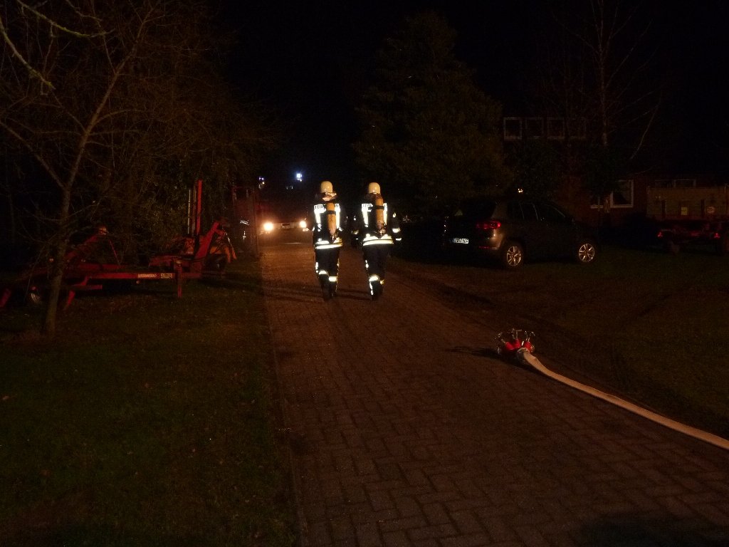 Auch bei diesem Einsatz bewehrte sich die zusätzliche Alarmierung der Ortsfeuerwehr Bramsche bei größeren Schadenslagen im Ortsteil Gleesen. Bei Eintreffen des ersten Emsbürener Einsatzfahrzeuges hatten die Kameraden aus Bramsche bereits eine vollständige Wasserversorgung errichtet, sodass der Angriffstrupp des HLF 20/16 unvezrüglich in den Innenangriff vorgehen konnte.