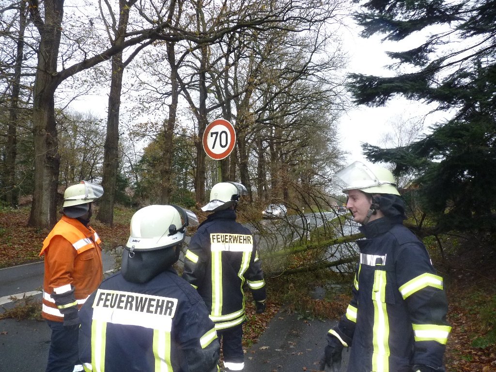 Durch dem zum Teil heftigen Sturm am heutigen Vormittag stürzte in Hövelstraße im Ortsteil Elbergen ein Baum im Garten eines Privatgrundstückes um. Da der Garten direkt an der Landesstraße 40 grenzt, stürzte der Baum quer auf den Radweg und zum Teil auf die Fahrbahn, sodass der Straßenverkehr auf der vielbefahrenden Straße gefährdet wurde.