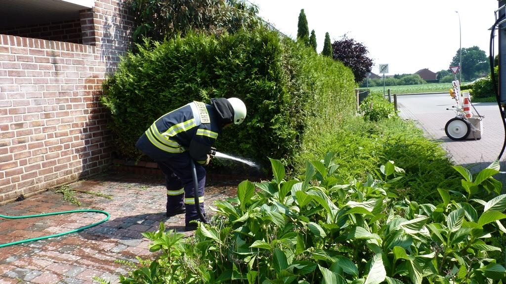 Zu einem Heckenbrand wurde die Freiwillige Feuerwehr Emsbüren am Dienstagnachmittag in den Geranienweg gerufen. Eine Hecke in direkter Nähe zu einem Wohnhaus hatte aus bislang unbekannten Gründen Feuer gefangen.