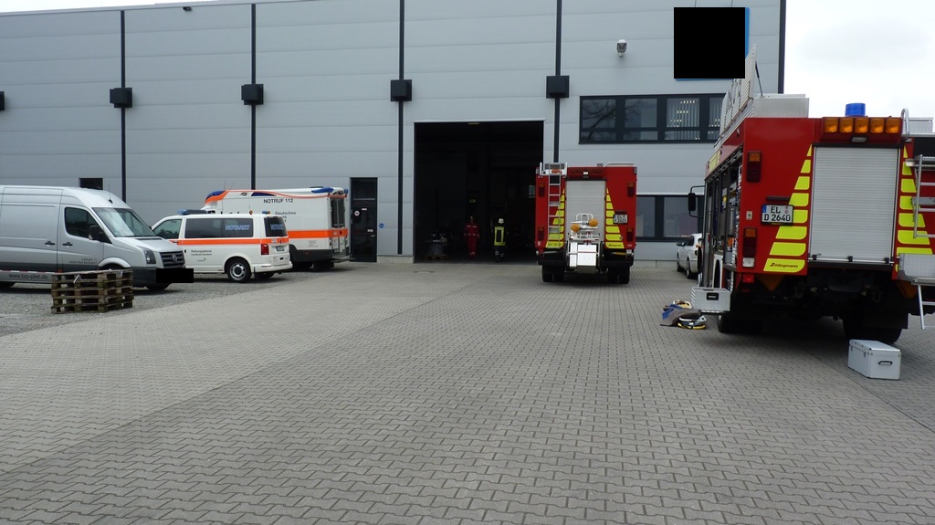 Eine Person war auf einen etwa 6 Meter hohen Aufbau in einer Werkhalle damit beschäftigt, Nägel mit einem Druckluftnagler zu befestigen. Aus bislang ungeklärter Ursache verletzte er sich dabei schwer und war nicht mehr in der Lage, den Aufbau selbstständig zu verlassen.