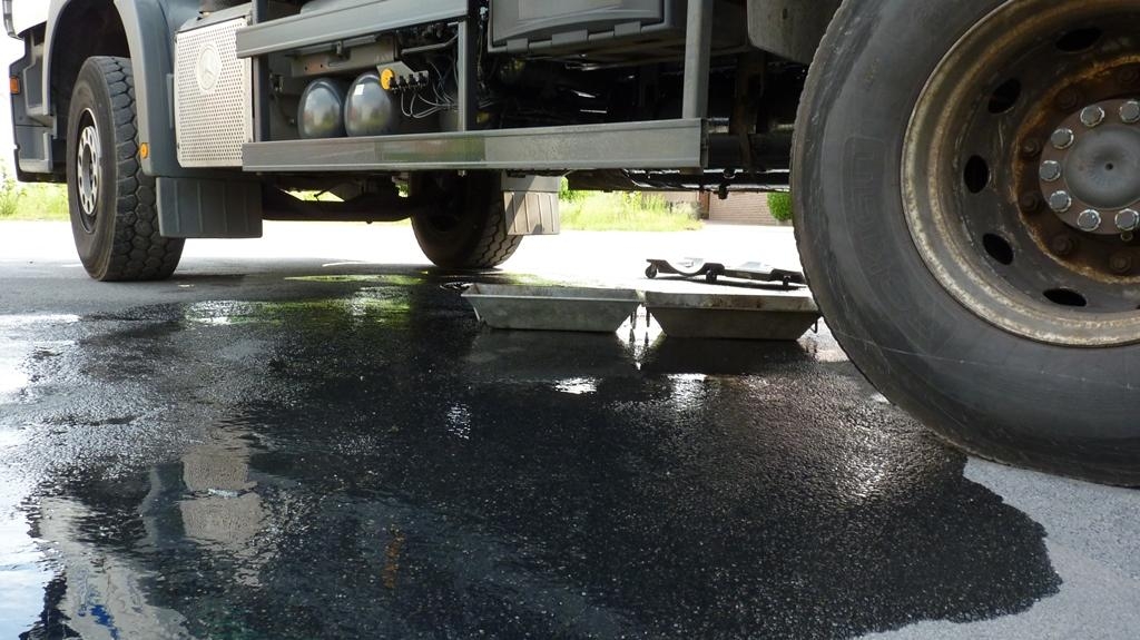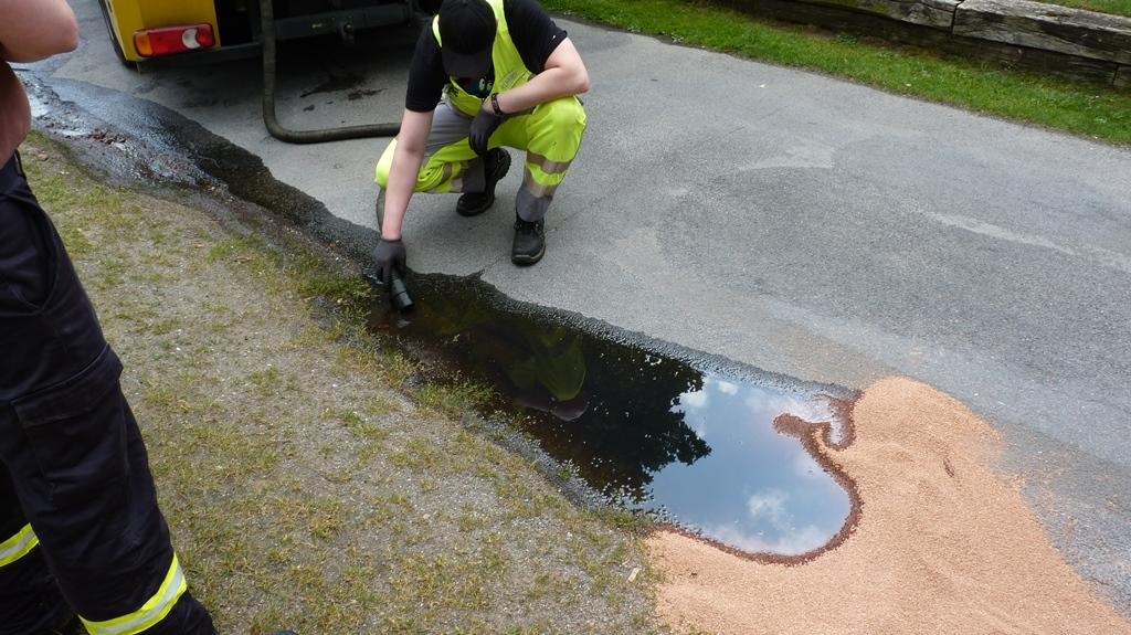 Ungünstigerweise befand sich das Fahrzeug zum Schadenszeitpunkt über einen Kanalschacht. Das Öl verteilte sich auf der abschüssigen Fahrbahn, zog teilweise ins Straßenbegleitgrün und lief in die Abwasserkanalisation.
