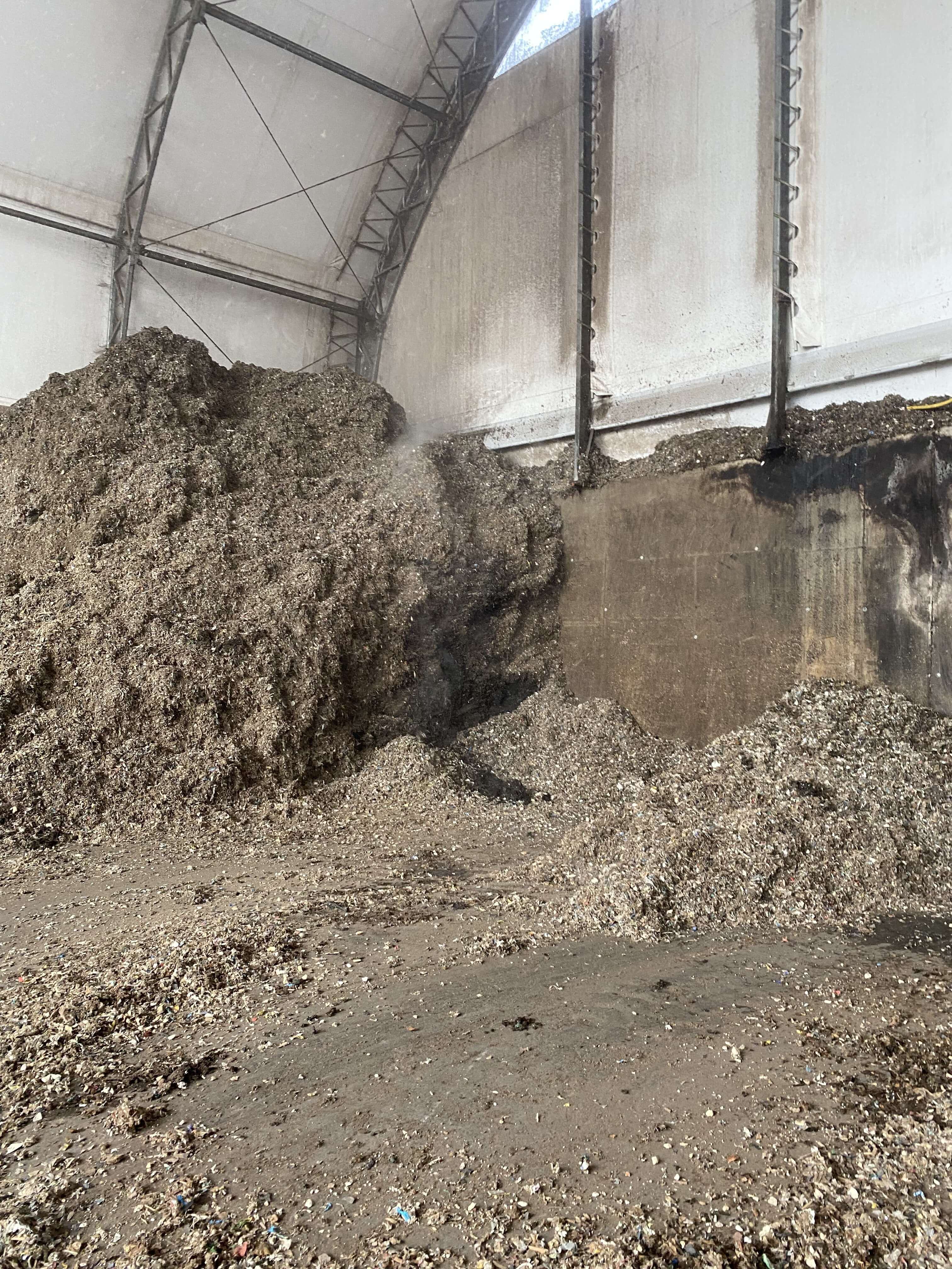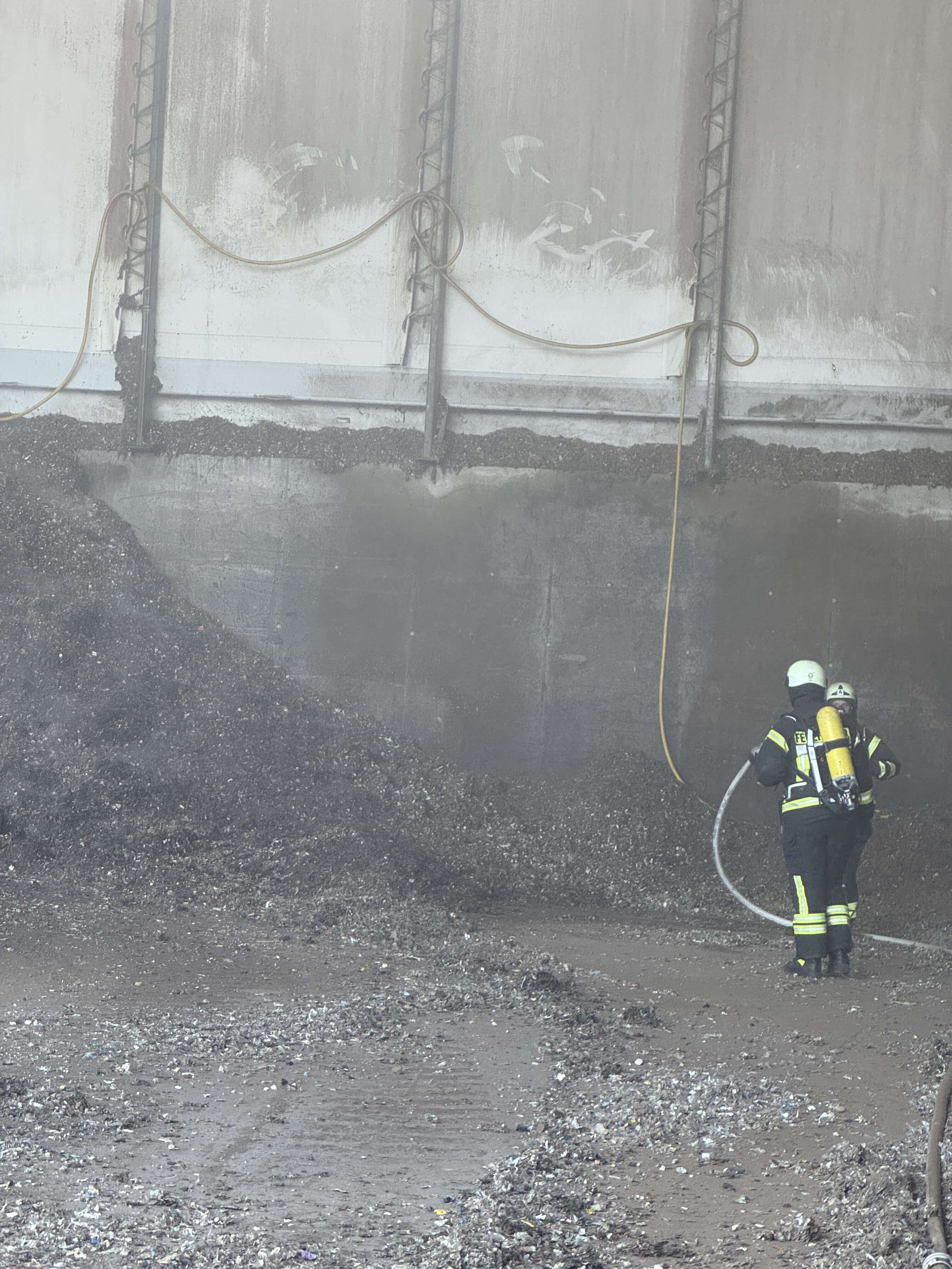 Vor Ort fanden wir eine Lage vor, bei der eine ca. 24 x 24 m große Lagerhalle betroffen war. In der Halle lagerten etwa 400 m³ geschredderter Abfall, bestehend aus Plastik, Textilien und Restmüll. Der Brand befand sich im hinteren Bereich der Halle und verursachte eine weithin sichtbare Rauchsäule. Um den Brandherd zu erreichen, war es notwendig, das nicht betroffene geschredderte Material mithilfe eines Radladers aus der Halle zu entfernen.