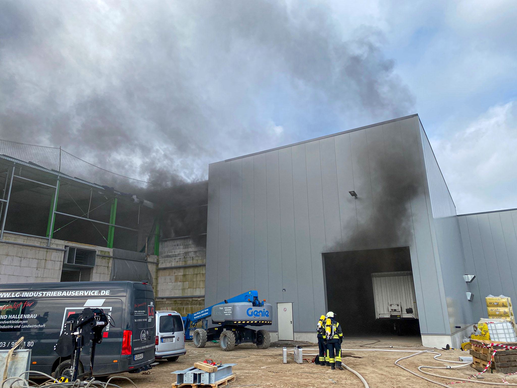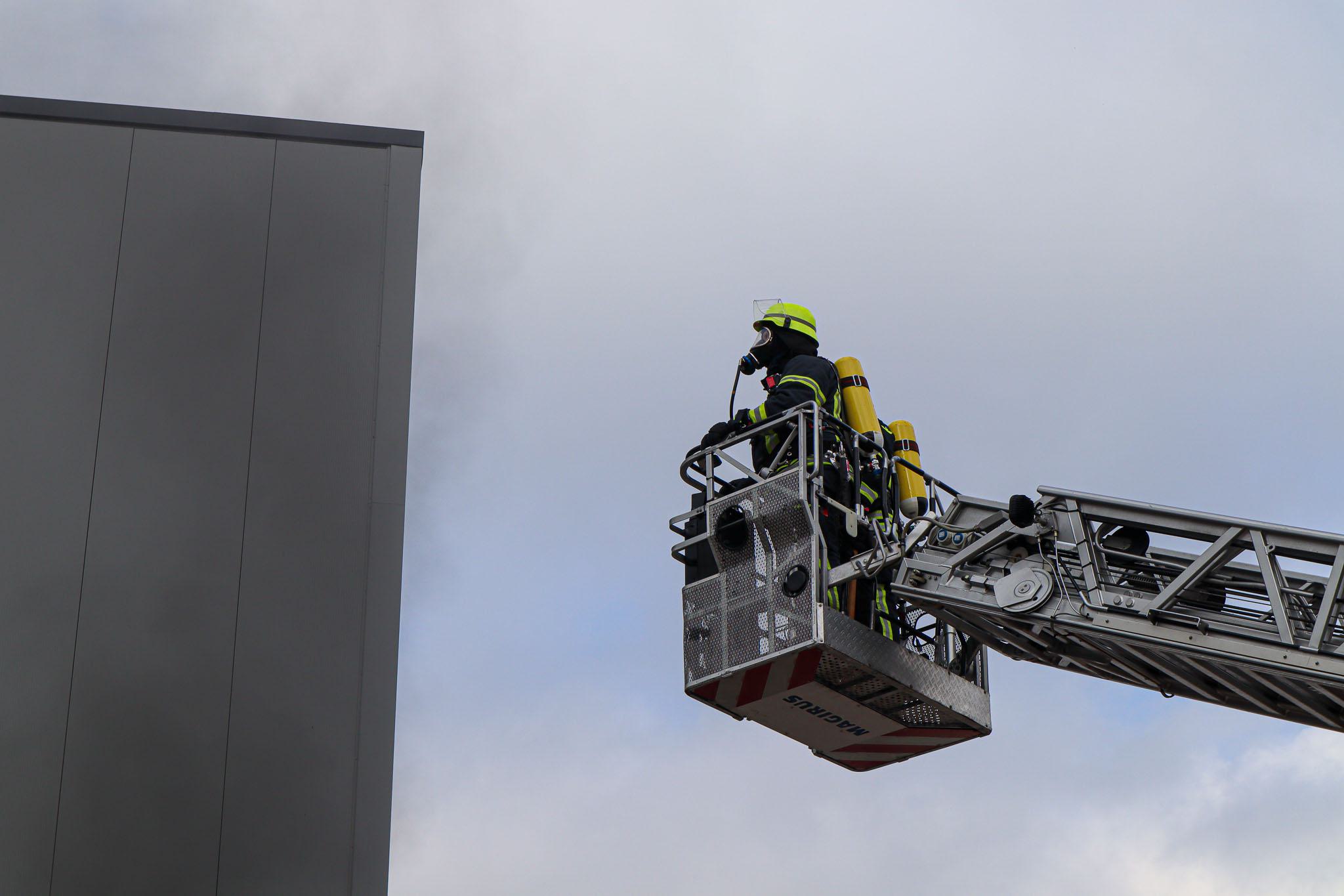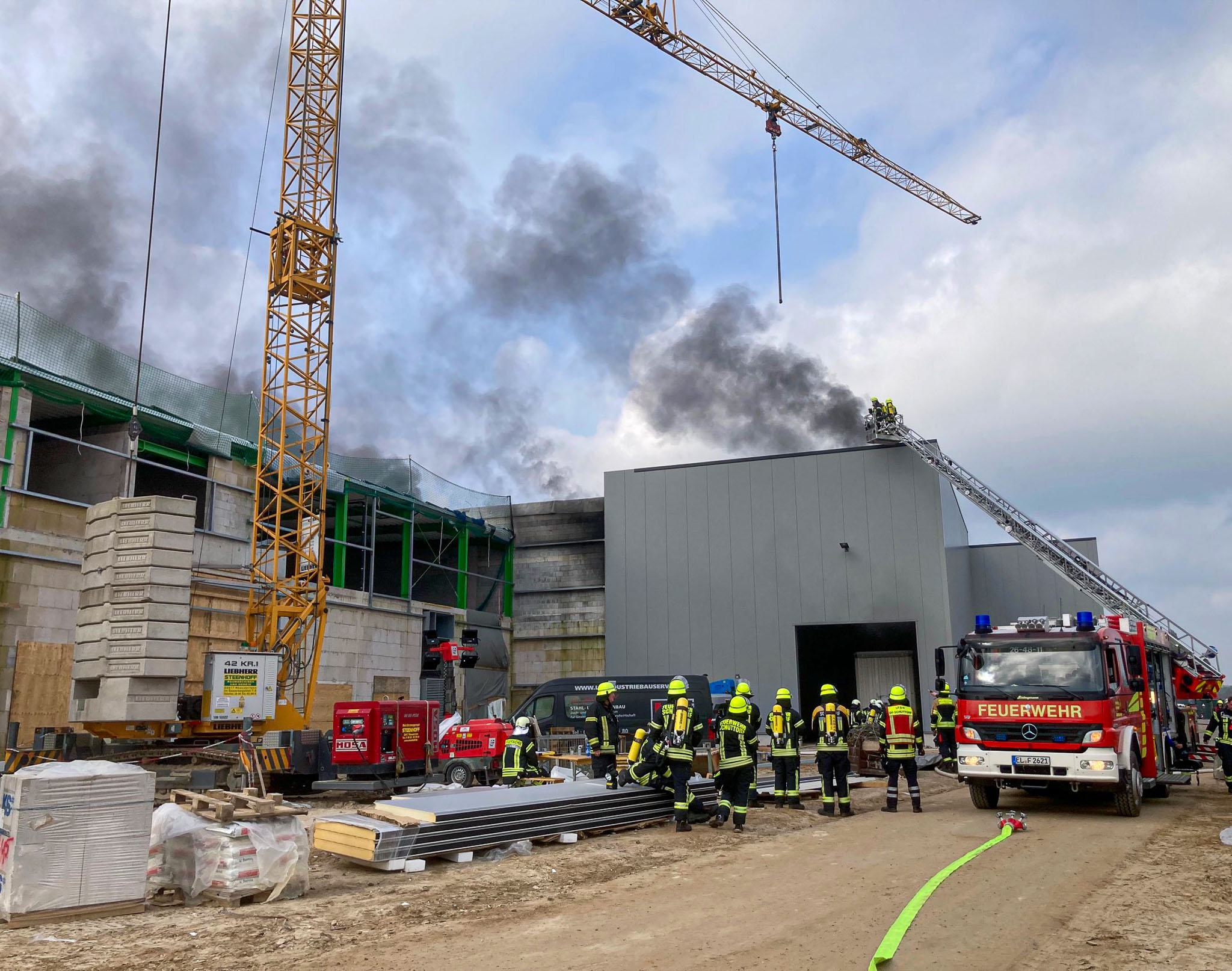 Beim Eintreffen der ersten Einsatzkräfte bestätigte sich das Bild: Aus einer Halle der Firma drang eine dunkle Rauchentwicklung. Sofort wurde mit dem Aufbau des Löschangriffs begonnen, und ein Trupp ging unter Atemschutz zum Brandherd vor, um diesen zu lokalisieren und einzudämmen. Es stellte sich heraus, dass es zu einem Brand in einem Förderband und einer Verdichtungsanlage von Pappe gekommen war. Währenddessen wurde parallel eine Wasserversorgung von einem Wassercontainer und Feuerlöschbrunnen eingerichtet, um eine ausreichende Wasserversorgung für den vorgehenden Trupp sicherzustellen.