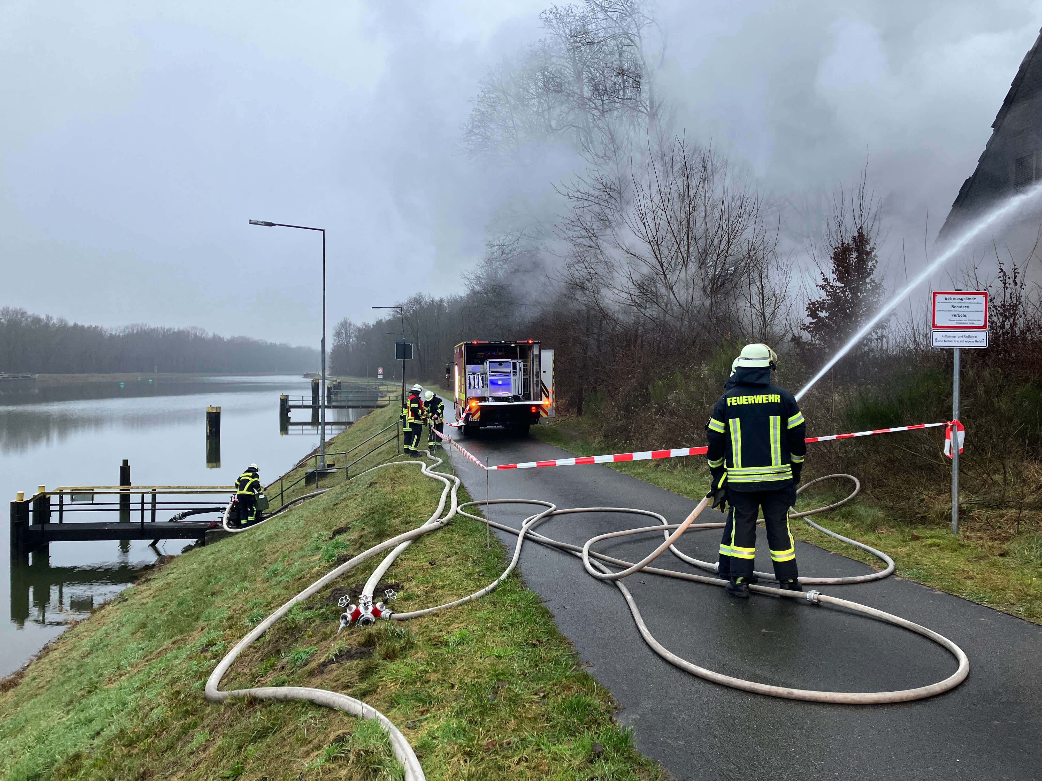 Sofort begannen die ersten Einsatzkräfte mit Atemschutzgeräten, Löschmaßnahmen außerhalb des Gebäudes mittels C-Strahlrohren durchzuführen. Ein weiterer Trupp erkundete das zunächst außerhalb Gebäude und führte dort ebenfalls Löschmaßnahmen durch. Die Wasserversorgung wurde zunächst über einen Unterflurhydranten und anschließend durch den Aufbau einer zusätzlichen Wasserversorgung aus dem Dortmund-Ems-Kanal mittels einer Tragkraftspritze sichergestellt.