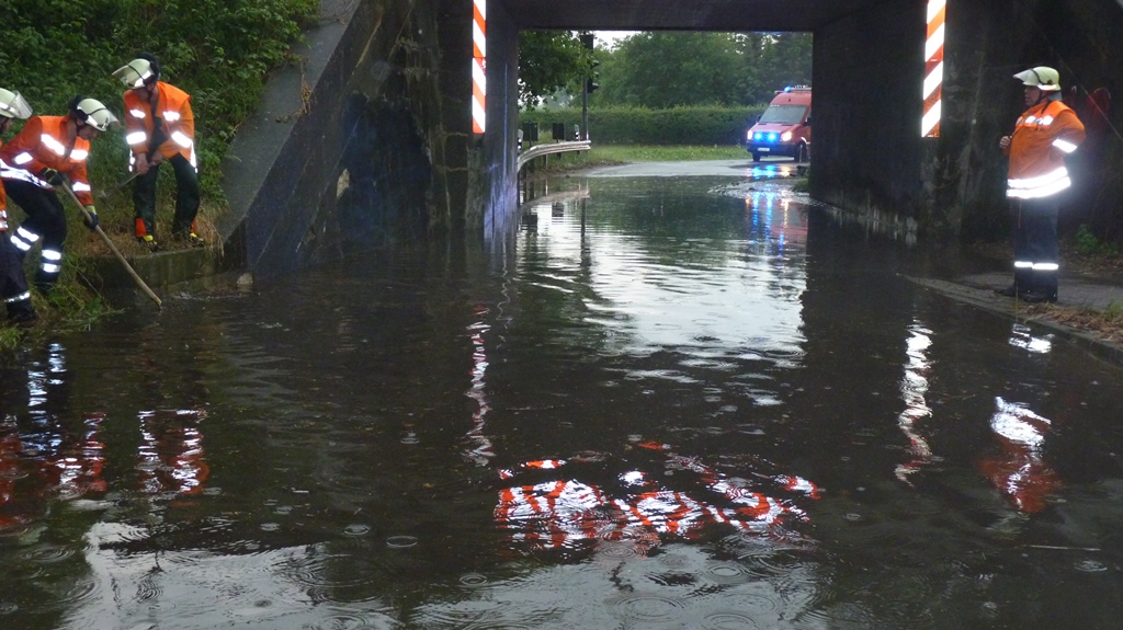Der dritte Einsatz wurde im Ortsteil Elbergen gemeldet. Die Bahnunterführung entlang der L40 stand aufgrund der starken Regenfälle massiv unter Wasser. Die Einsatzkräfte vor Ort sicherten die Einsatzstelle ab und konnten durch das Reinigen der Regeneinläufe das angestaute Wasser abfließen lassen. Vor Ort waren der ELW 1 und das HLF 20/16 mit 11 Einsatzkräften.