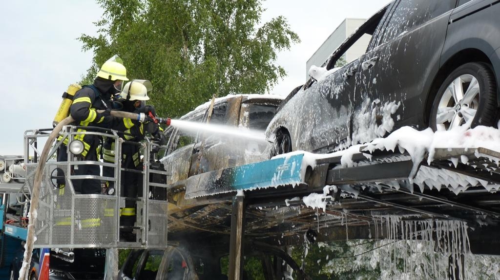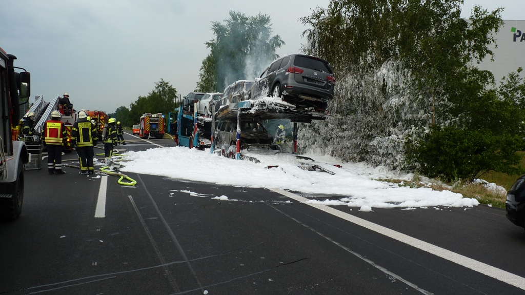 Um 7.09 Uhr wurde am Freitagvormittag die Ortsfeuerwehr Schüttorf zu einem Fahrzeugbrand auf die Bundesautobahn 31 gerufen. In Fahrtrichtung Süden war kurz hinter dem Schüttorfer-Kreuz aus noch unbekannten Gründen ein vollbeladener Fahrzeugtransporter in Brand geraten. Mehrere auf dem Auflieger befindliche Fahrzeuge standen teils in Vollbrand.