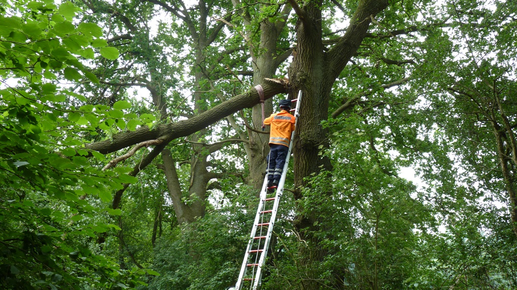 Nach kurzer Suche fanden die ausgerückten Kräfte eine größere Eiche vor, aus der ein großer Ast gebrochen war. Der Ast konnte durch einige Holzfasern am Baum gehalten werden, drohte jedoch auf den Weg zu fallen.