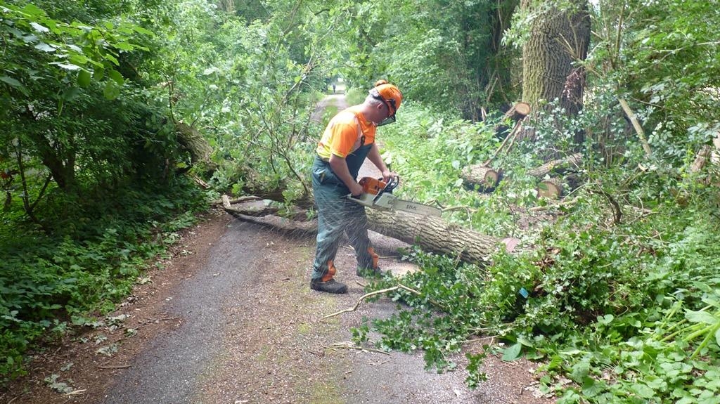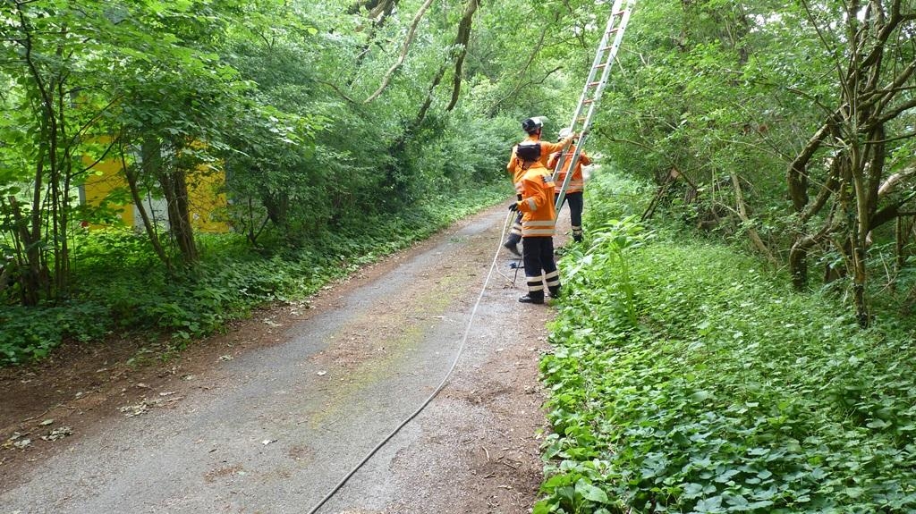 Kurz hinter dieser Einsatzstelle wurde ein weiterer beschädigter Baum vorgefunden, aus dem ebenfalls ein Ast zu fallen drohte. Da der Baum bereits schadhaft war, wurde er vollständig gefällt.