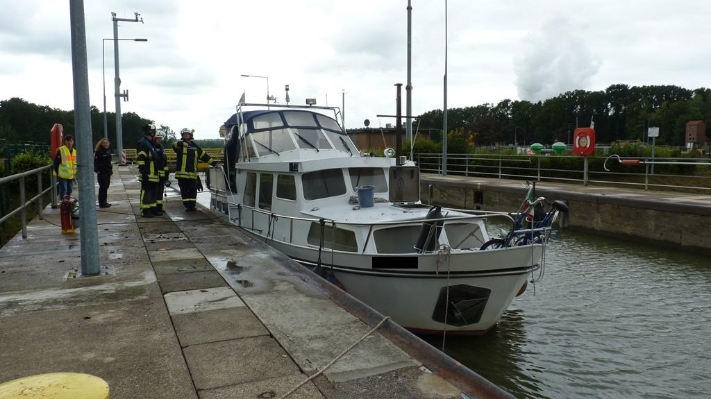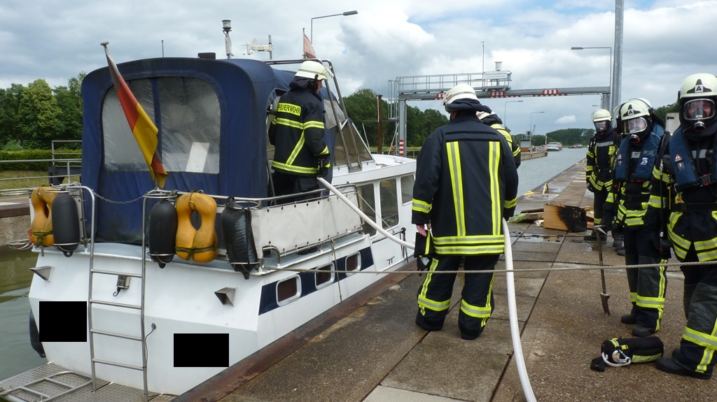 Bei Eintreffen der ersten Kräfte aus Bramsche befand sich das Motorboot angelegt in der Schleusenanlage. Es drang dichter Rauch aus dem Wohnbereich. Der Besitzer hatte versucht, den Brand mit einem CO2-Feuerlöscher unter Kontrolle zu bekommen. Ein Trupp der Ortsfeuerwehr Bramsche ging unter schwerem Atemschutz in den Innenangriff vor. Mit Hilfe der Wärmebildkamera konnte der Brandherd gezielt lokalisiert und gelöscht werden. Es brannten Teile der Inneneinrichtung im Wohnbereich des Bootes. Das Feuer war schnell gelöscht. Die durch das Feuer in Mitleidenschaft geozgene Einrichtung wurde durch den Trupp unter Atemschutz aus dem Boot transportiert, um Glutnester offenzulegen und einem Wiederentfachen des Feuers vorzubeugen. Durch das schnelle Eingreifen der Feuerwehr konnte größerer Schaden abgewendet und ein Übergreifen auf das naheliegende Tankschiff verhindert werden.