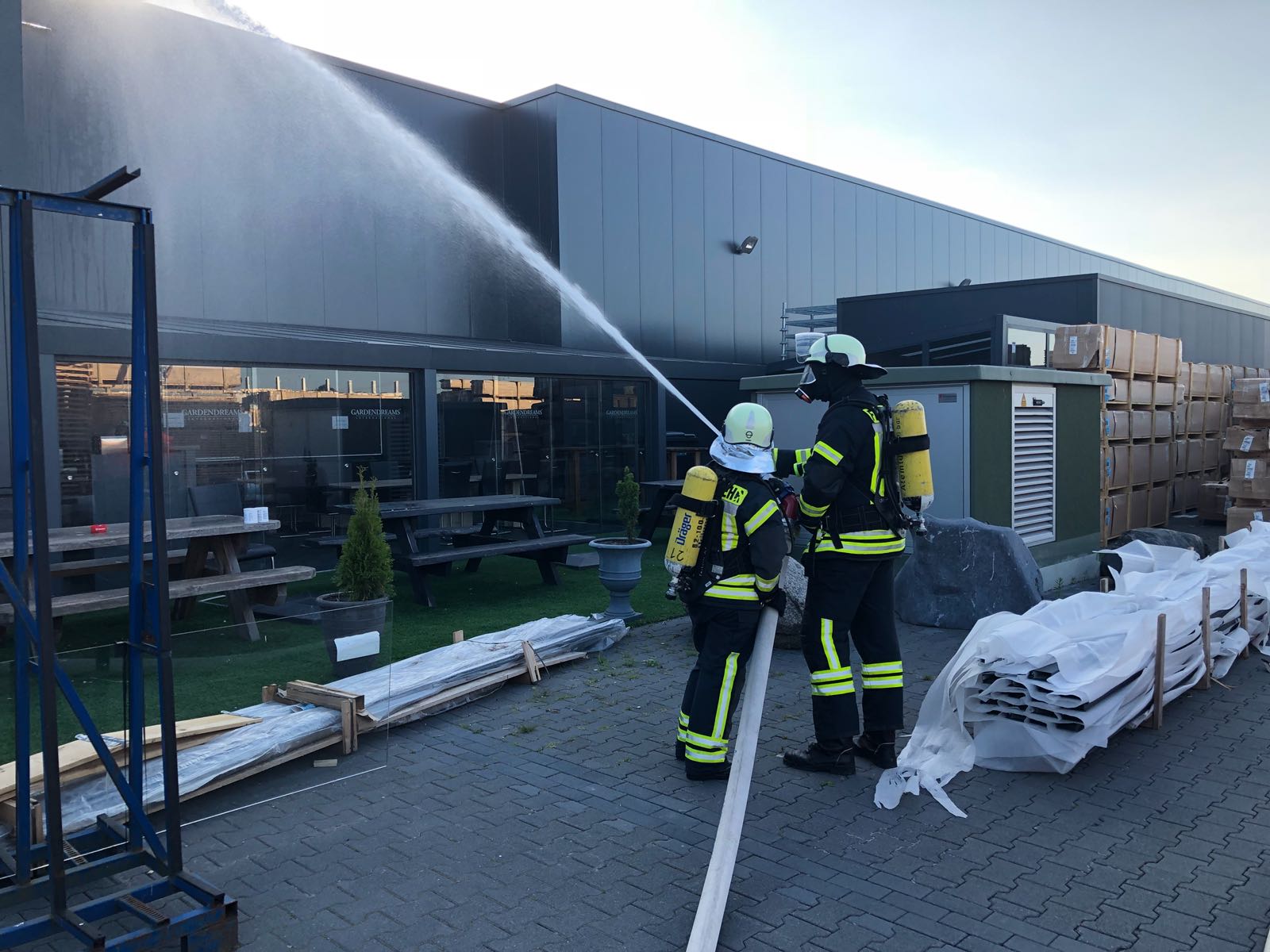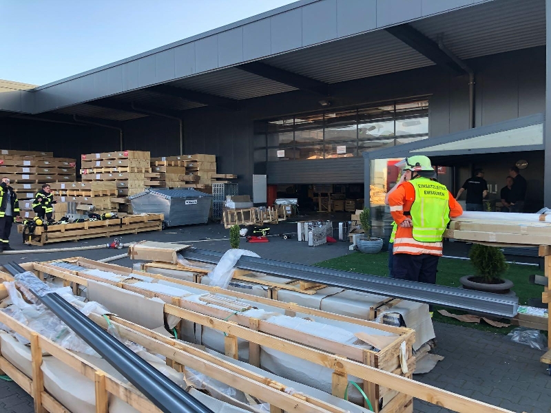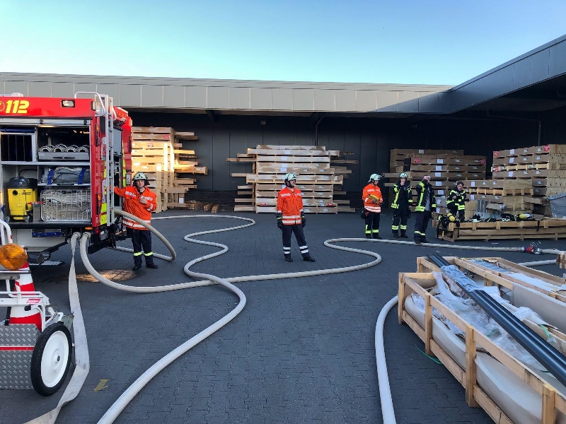 Nach Eintreffen an der Einsatzstelle stellte der Einsatzleiter bei seiner Erkundung fest, dass bereits offene Flammen aus dem Gebäude schlagen. Er veranlasste daraufhin eine Alarmstufenerhöhung auf "Industrie- und Gewerbebrand". Es wurde Vollalarm für alle verfügbaren Kräfte ausgelöst. Wegen des Übungsdienstes waren einige Fahrzeuge bereits im Gemeindegebiet unterwegs. Sie brachen den Übungsdienst ab und begaben sich zur "Einsatzstelle". Weitere Kräfte rückten aus dem Feuerwehrhaus aus.