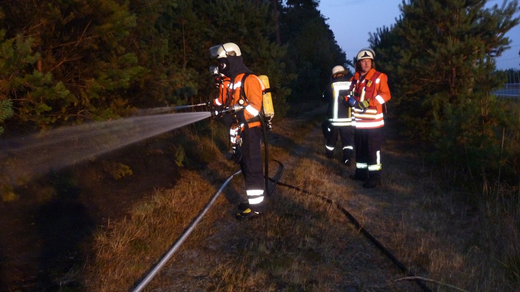 Als die ersten Kräfte vor Ort eintrafen standen etwa 70 m² Böschung hinter einem Wildschutzzaun neben der Autobahn in Brand. Die Flammen drohten auf einen angrenzenden Kiefernwald überzugreifen. Ein Trupp unter schwerem Atemschutz nahm zwei C-Rohre vor und konnte ein Ausdehnen auf den Kiefernwald verhindern. Das Feuer war durch den massvien Wassereinsatz rasch gelöscht.