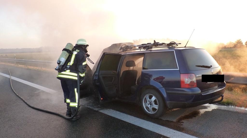 Wenige Stunden nach dem letzten Einsatz wurden wir erneut auf die Autobahn 31 gerufen. Am frühen Samstagmorgen fing der Motorraum eines in Richtung Norden fahrenden VW Passats Feuer. Kurz zuvor hatte der Fahrer einen Leistungsabfall seines Autos bemerkt und das Auto zwischen den Anschlussstellen Emsbüren und Lingen-Lohne zum Stehen gebracht. Kurz nachdem er und sein Beifahrer das Auto verlassen hatten, fing der Motorraum Feuer.