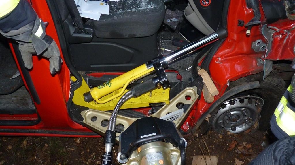 In enger Zusammenarbeit beider Feuerwehren und des Rettungsdienstes wurde der eingeklemmte Beifahrer befreit. Nachdem Rettungsdienst und Notarzt die Erstversorgung durchgeführt hatten, wurde das Fahrzeug zunächst mit der Seilwinde des Rüstwagens vom Baum weggezogen. Anschließend musste schwerstes hydraulisches Rettungsgerät eingesetzt werden, um die Tür zu entfernen und den "Vorderwagen" nach vorne zu bewegen. So konnte die Person schließlich entklemmt und mit einem Spineboard befreit werden. Die Person wurde mit lebensbedrohlichen Veletzungen mit einem Rettungswagen ins Krankenhaus verbracht.